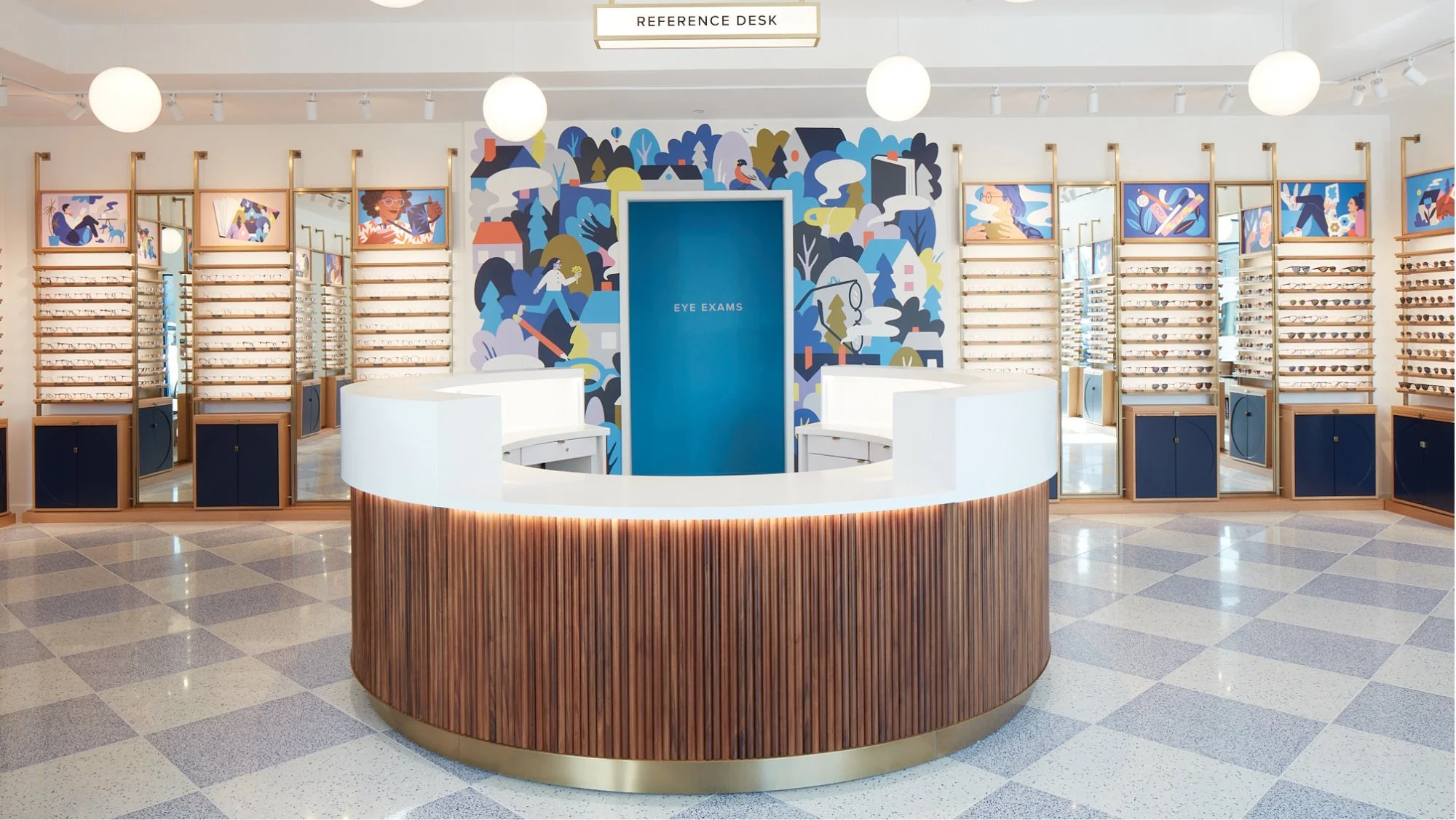 I was asked to create a mural and 20 illustration panels to go above the eye glass cases.